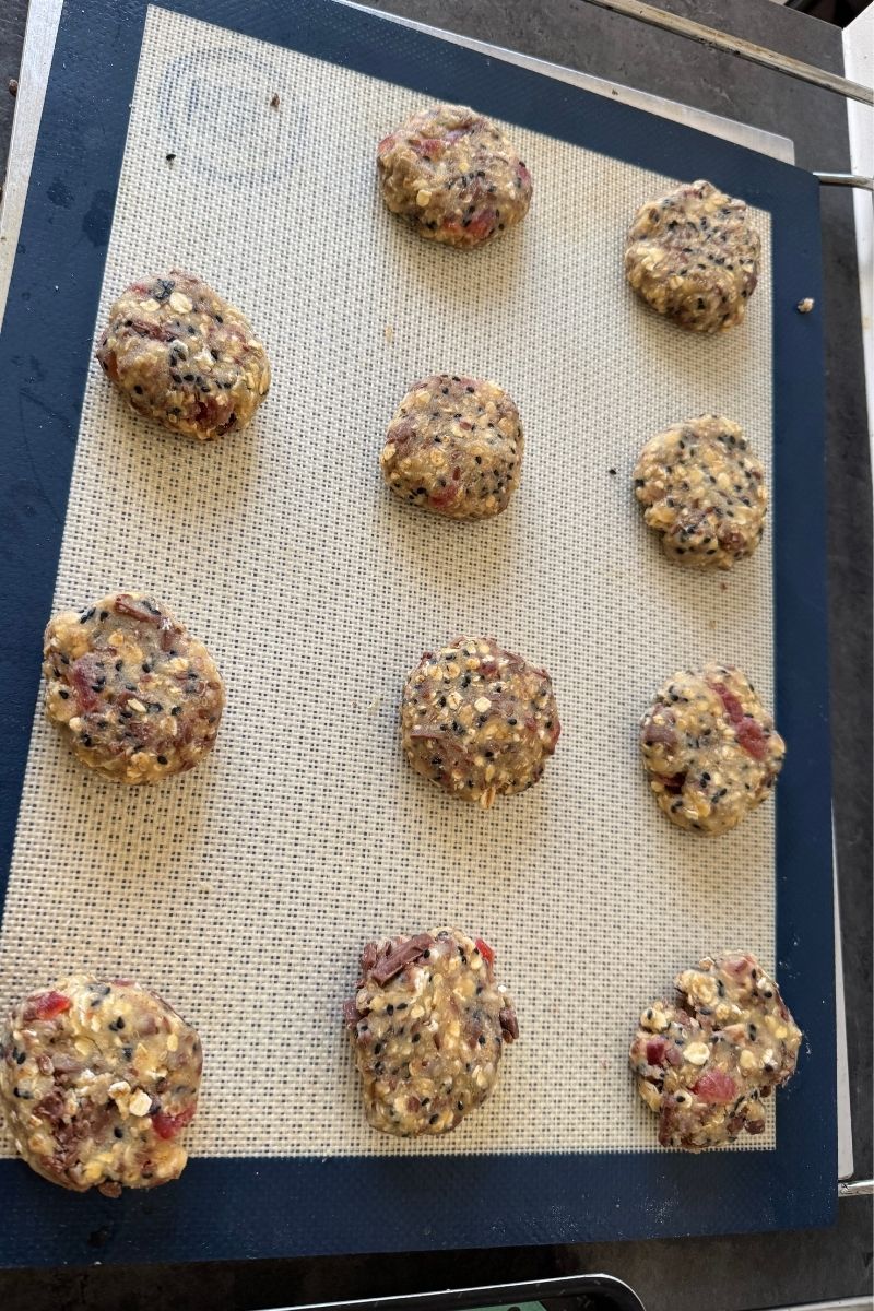 - 分割麵糰:將麵糰分成約 23 個小球,每個約 40克,在約抓幾個切好的果乾放入,做成圓形。放在烤盤上(可用鋪烘焙紙),再用手掌按壓。