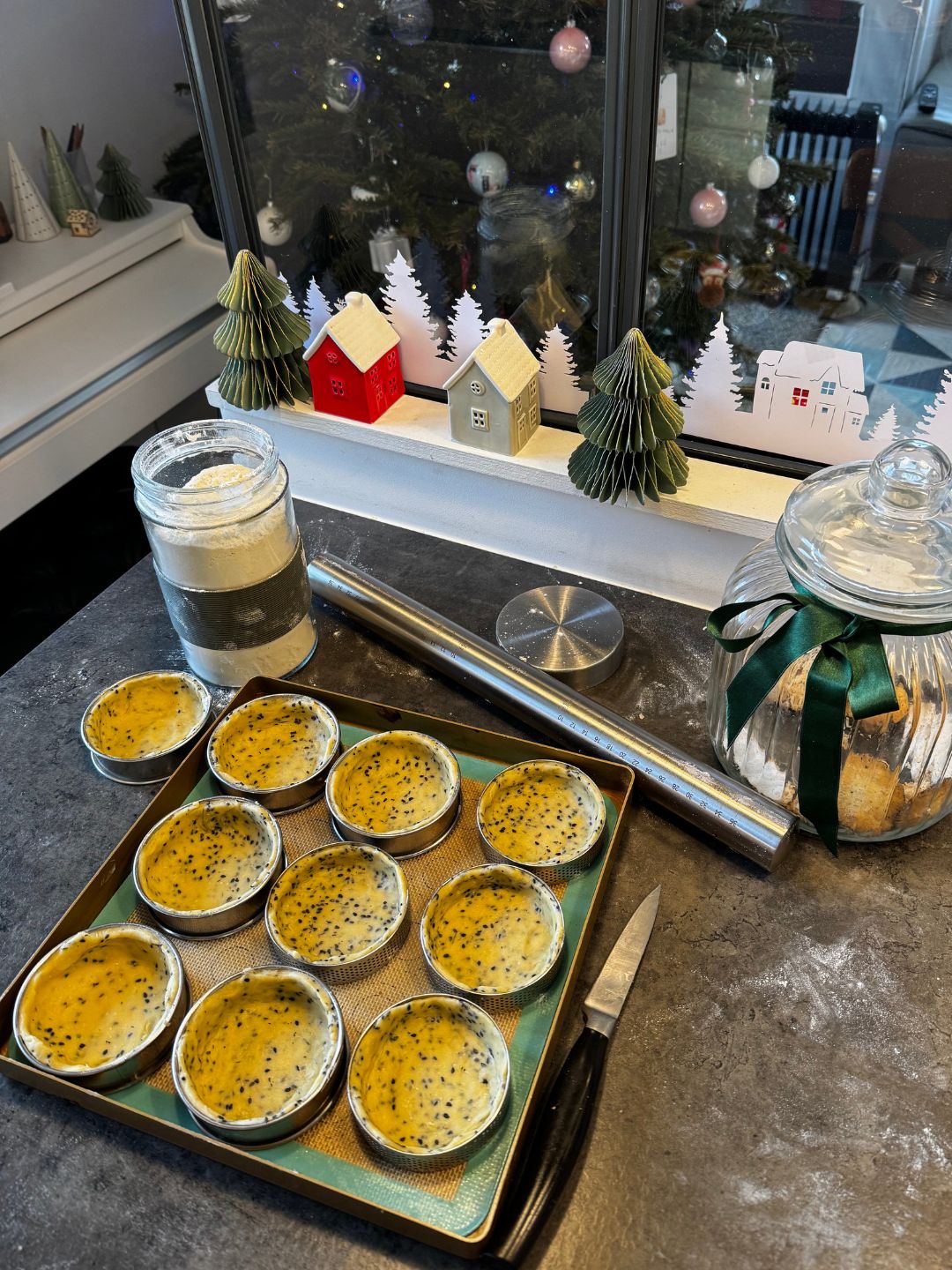 今年,我準備了一份 蔬菜煙燻培根鹹派(Quiche aux légumes et lardons fumés),正好符合酒會式餐點的精神:派皮酥脆、餡料豐富,方便拿取、隨時享用。它讓聚會更自由、更熱鬧。這是法國常見的料理之一,但我特別把它做成 10 個小塔,方便在我們 14 人的聚會裡分享。小塔的形式,就像 buffet 一樣,不需要拘泥在餐桌,大家可以隨時拿著吃,走到不同角落和朋友聊天。這樣的設計,讓聚會更自由、更有互動感。